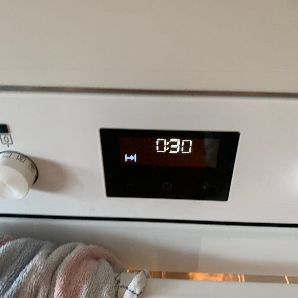 Sätt ugnen på 225 grader och den ska vara inne i 30 minuter